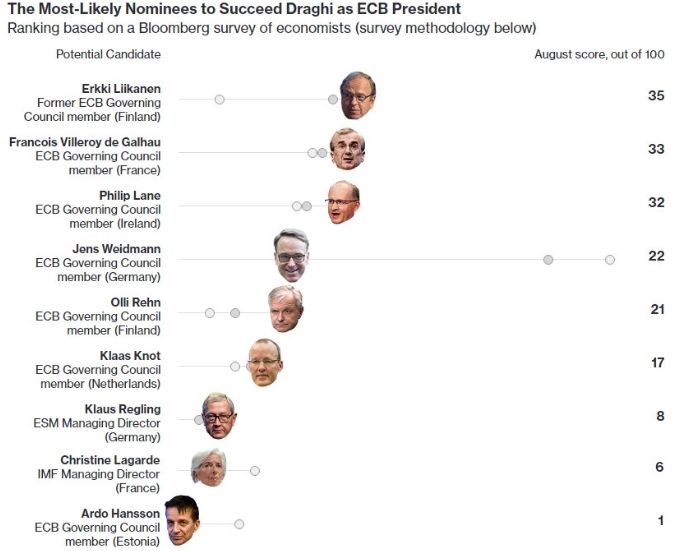Έτσι, φαβορί στην «κούρσα» διαδοχής πλέον θεωρείται ο Έρκι Λιικάνεν, ο πρώην Κεντρικός Τραπεζίτης της Φινλανδίας αν και τον ακολουθούν σε μικρή απόσταση ο διοικητής της Κεντρικής Τράπεζας της Γαλλίας Φρανσουά Βιλερουά ντε Γκαλώ και ο διοικητής της Κεντρικής Τράπεζας της Ιρλανδίας Φίλιπ Λέιν.