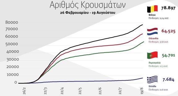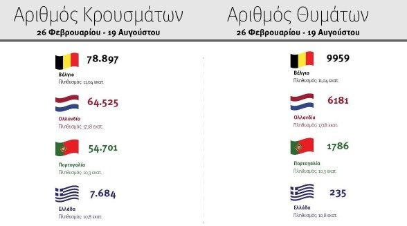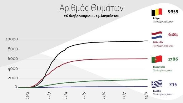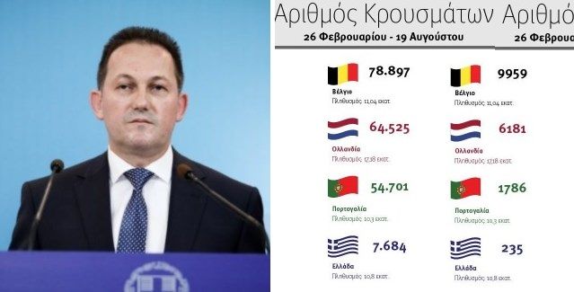«Οι θάνατοι που αποτελούν τον πιο σκληρό, τον πιο θλιβερό, αλλά και τον πιο αδιάψευστο δείκτη για το κόστος που πληρώνει κάθε χώρα από την πανδημία ανέρχονται σε 770.273 παγκοσμίως, σε 179.660 στην Ε.Ε. και σε 235 στην Ελλάδα. Προκύπτει έτσι ότι σε παγκόσμιο επίπεδο, ο μέσος όρος κρουσμάτων είναι 2.831 ανά ένα εκατομμύριο κατοίκους. Αντίστοιχα, στην Ελλάδα ανέρχονται σε 693 ανά ένα εκατομμύριο κατοίκους. Και ενώ ο μέσος όρος θανάτων παγκοσμίως είναι 100 ανά ένα εκατομμύριο κατοίκους, στην Ελλάδα είναι 22, δηλαδή πέντε φορές περίπου μικρότερος. Έτσι, η χώρα μας κατατάσσεται στην 132η θέση ως προς τα κρούσματα του κορονοϊού και στην 108η θέση ως προς τους θανάτους ανά εκατομμύριο κατοίκους” ανέφερε ο κυβερνητικός εκπρόσωπος. Παρουσίασε γραφήματα σύμφωνα με τα οποία αποδεικνύεται “η καλύτερη επιδημιολογική εικόνα στην Ελλάδα έναντι άλλων χωρών” και “απαντά σε όλους εκείνους που προσπαθούν να καλλιεργήσουν την εικόνα ότι «το πράγμα ξεφεύγει στη χώρα μας».