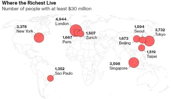 Ωστόσο, περίπου το ήμισυ αυτής της ελίτ έχουν τις κύριες κατοικίες τους μέσα σε μια ομάδα μόλις 10 πόλεων, σύμφωνα με την έκθεση 2019 Wealth Report της Knight Frank, η οποία απαριθμεί το Λονδίνο, το Τόκιο και τη Σιγκαπούρη ως τις πόλεις κατοικίας για τους περισσότερους ανθρώπους η περιουσία των οποίων είναι αξίας τουλάχιστον 30 εκατομμυρίων δολαρίων. Αν και οι ΗΠΑ είναι η μεγαλύτερη οικονομία παγκοσμίως, η Νέα Υόρκη είναι η μοναδική πόλη στην κορυφή των τοπ 10 της λίστας των πόλεων που ζουν οι υπερβολικά πλούσιοι.