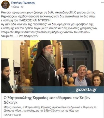 Μύδρους κατά του μητροπολίτη Κηφισιάς, Αμαρουσία και Ωρωπού Κυρίλου εξαπέλυσε ο αναπληρωτής υπουργός Υγείας Παύλος Πολάκης με αφορμή την ποιμαντορική εγκύκλιο του ιερωμένου για το Πάσχα και τις αναφορές του στον Στίβεν Χόκινγκ.