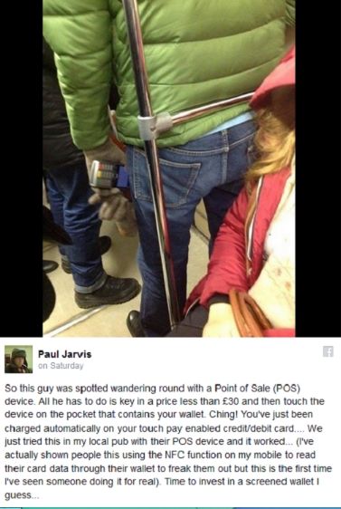 Σύμφωνα με το δημοσίευμα, ο Πολ Τζάρβις ανήρτησε στο προφίλ του στο Facebook μία φωτογραφία ενός άνδρα, ο οποίος ενώ επέβαινε σε συρμό του μετρό είχε σε λειτουργία ένα φορητό τερματικό αποδοχής καρτών POS (Point of Sale).