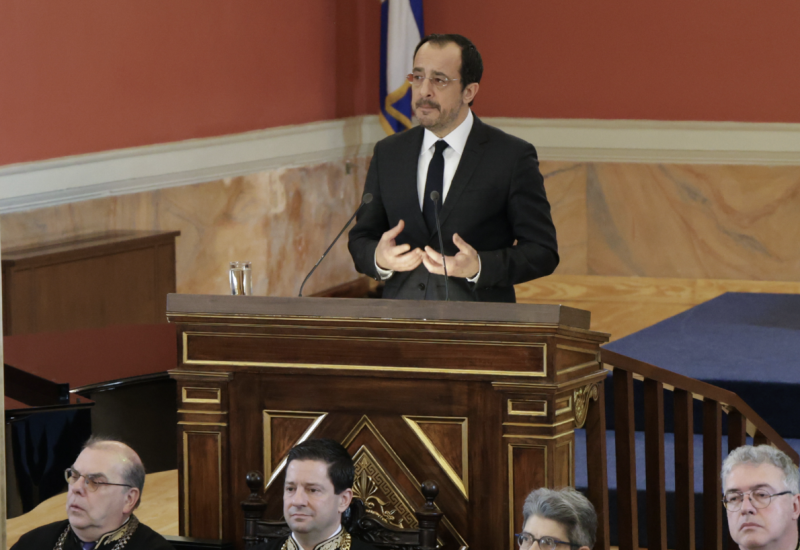 Ο Πρόεδρος της Κυπριακής Δημοκρατίας άρχισε τον χαιρετισμό του, εκφράζοντας θλίψη για την απώλεια της Ελένης Γλύκατζη Αρβελέρ «της μεγάλης Ελληνίδας, Ελληνίδας του κόσμου, που υπηρέτησε τα γράμματα, την επιστήμη της Ιστορίας, αλλά, κυρίως, υπηρέτησε την αλήθεια. Από το βήμα του Πανεπιστημίου Αθηνών, στο οποίο φοίτησε και η ίδια, μεταφέρω εκ μέρους της Κυβέρνησης της Κυπριακής Δημοκρατίας και του κυπριακού λαού τα συλλυπητήριά μας», είπε.