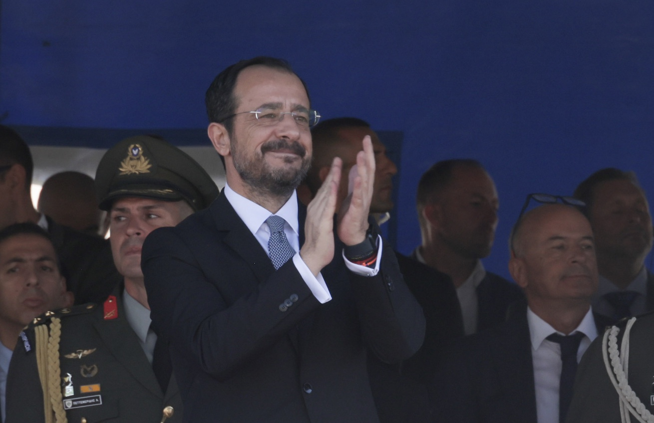 Ο Πρόεδρος της Δημοκρατίας δέχθηκε τον χαιρετισμό της στρατιωτικής παρέλασης για την επέτειο της Ανακήρυξης της Ανεξαρτησίας της Κυπριακής Δημοκρατίας