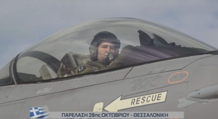 Ακολούθησαν και άλλοι άκρως απαιτητικοί και ταυτόχρονα εντυπωσιακοί ελιγμοί, μέχρι τη στιγμή που ο πιλότος του μαχητικού, σμηναγός της Πολεμικής Αεροπορίας, Γιώργος Σωτηρίου, πήρε το λόγο και απηύθυνε το καθιερωμένο μήνυμα για τον εορτασμό της 28ης Οκτωβρίου.