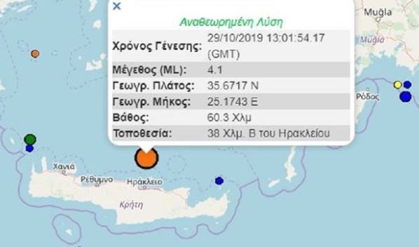 Σεισμός έντασης 4,1 βαθμών της κλίμακας Ρίχτερ σημειώθηκε στις 15:01 στη θαλάσσια περιοχή βόρεια του Ηρακλείου Κρήτης.