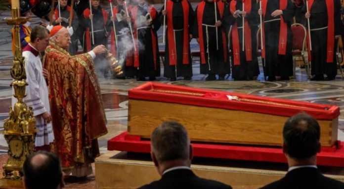Ολοκληρώθηκε η τελετή μεταφοράς του σκηνώματος του εκλιπόντα πάπα Φραγκίσκου, από τον ξενώνα της Αγίας Μάρθας, στο εσωτερικό της Βασιλικής του Αγίου Πέτρου. Το φέρετρο είναι ανοικτό και μεταφέρθηκε από τους «σεντιάρι». Πρόκειται για μη κληρικούς, οι οποίοι τίθενται στις υπηρεσίες του εκάστοτε ποντίφικα. Η πομπή, πέρασε πρώτα από τον εξωτερικό χώρο της πλατείας του Αγίου Πέτρου, όπου οι συγκεντρωμένοι προσκυνητές χειροκρότησαν, με εμφανή συγκίνηση.