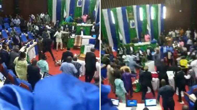 Σύμφωνα με βίντεο που είδε το φως της δημοσιότητας, εκπρόσωποι του κυβερνώντος Λαϊκού Κόμματος της Σιέρα Λεόνε (SLPP) και του αντιπολιτευόμενου κόμματος All People’s Congress (APC) φαίνονται να τσακώνονται και να πετούν καρέκλες, ενώ δεν έλειψαν οι μπουνιές και οι κλωτσιές.