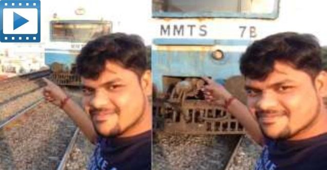 Στο απίστευτο βίντεο φαίνεται ο Σίβα να ποζάρει στο κινητό του τηλέφωνο ενώ στο βάθος φαίνεται να πλησιάζει ένα τρένο με ταχύτητα.