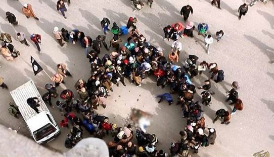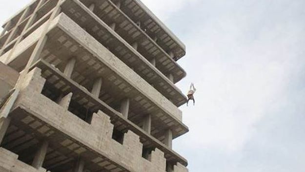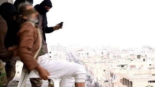 Φωτογραφίες τις οποίες δημοσίευσε η τουρκική εφημερίδα Hurriyet, προκαλούν σοκ και αποτροπιασμό οι φρικιαστικές εικόνες της απάνθρωπης στιγμής που τζιχαντιστές ρίχνουν στο κενό έναν ομοφυλόφιλο.