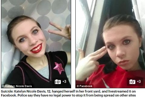 Η Katelyn Nicole Davis, από το Cedartown της Τζόρτζια μετέδωσε live την αυτοκτονία της στο Facebook στις 30 Δεκεμβρίου. Το νεαρό κορίτσι είχε προαναγγείλει πως θα βάλει τέλος στη ζωή του επειδή συγγενής της την κακοποιούσε σεξουαλικά και εκείνη δεν άντεχε να ζει άλλο. Το άτυχο κορίτσι κρεμάστηκε στην αυλή του σπιτιού του.