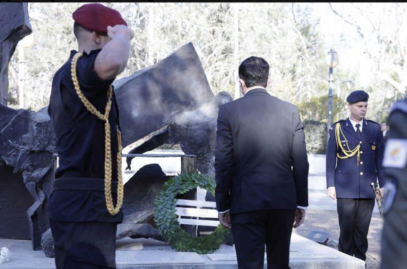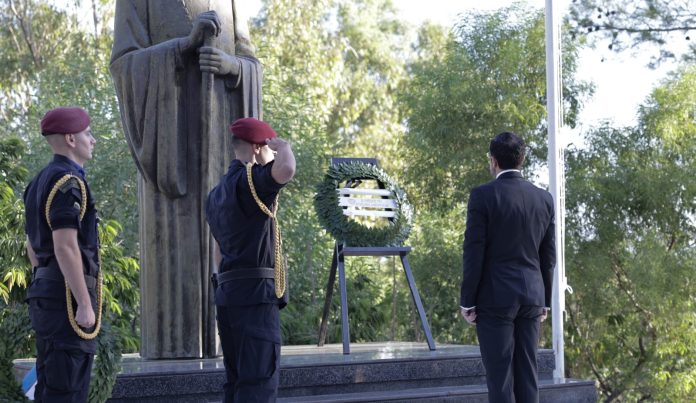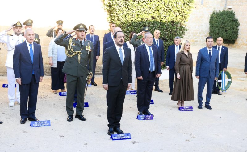 Στη συνέχεια ο Πρόεδρος Χριστοδουλίδης μετέβη στο Προεδρικό Μέγαρο, όπου κατέθεσε στεφάνι στον ανδριάντα του Εθνάρχη Μακαρίου Γ’, στον προαύλιο χώρο του Μεγάρου.