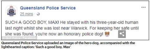 Η αστυνομία έχρισε αμέσως τον τετράποδο ήρωα μέλος του αστυνομικού σώματος. «Τι καλό αγόρι, Μαξ!» έγραψε στο λογαριασμό του στο Facebook η αστυνομία του Κουίνσλαντ. «Τώρα είσαι επίτιμος σκύλος της αστυνομίας!», πρόσθεσε, αναρτώντας μια φωτογραφία του ζώου.