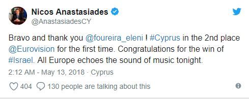 Ο Πρόεδρος έγραψε, «Μπράβο και ευχαριστούμε Ελένη. Η Κύπρος στη δεύτερη θέση της Eurovision για πρώτη φορά. Συγχαρητήρια στο Ισραήλ για τη νίκη».