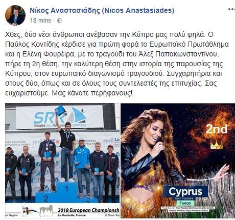 Μέσα από τη σελίδα του στο facebook συνεχάρη και τους δύο, Παύλο Κοντίδη και Ελένη Φουρέιρα: