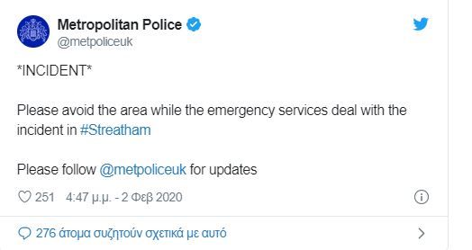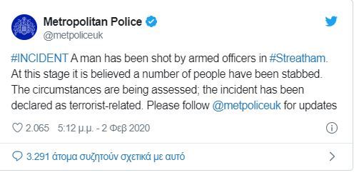 «Ένας άντρας δέχθηκε πυροβολισμούς από ένοπλους αξιωματικούς στην Streatham. Σε αυτό το στάδιο πιστεύεται ότι ένας αριθμός ανθρώπων μαχαιρώθηκε» ανακοίνωσε η Μητροπολιτική Αστυνομία, που ερευνά τι συνέβη. «Το περιστατικό ανακηρύχθηκε ως συνδεόμενο με την τρομοκρατία», πρόσθεσε στο twitter.