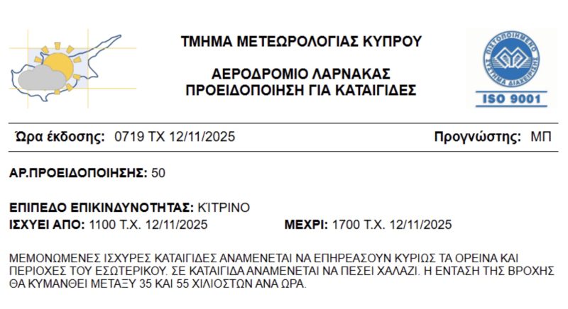 - Η Δύναμη της Πολιτικής Άμυνας, μετά από σχετική ανακοίνωση του Τμήματος Μετεωρολογίας σχετικά με μεμονωμένες ισχυρές καταιγίδες (αναμένεται και χαλαζόπτωση) και ανέμους, που αναμένεται να επηρεάσουν κυρίως τα ορεινά και περιοχές του εσωτερικού, προβαίνει στις πιο κάτω συστάσεις προς το κοινό με στόχο την πρόληψη και την ορθή προετοιμασία για ελαχιστοποίηση των κινδύνων και των αρνητικών συνεπειών: