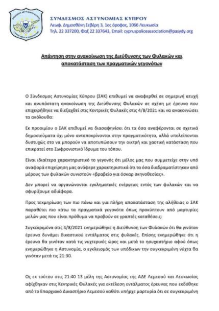 Ο Σύνδεσμος Αστυνομίας Κύπρου (ΣΑΚ) επιθυμεί να αναφερθεί σε σημερινή ατυχή και ανυπόστατη ανακοίνωση της Διεύθυνσης Φυλακών σε σχέση με έρευνα που επιχειρήθηκε να διεξαχθεί στις Κεντρικές Φυλακές στις 4/8/2021 και να ανακοινώσει τα ακόλουθα: