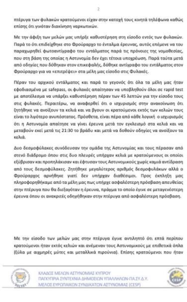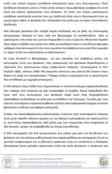 Πέραν του αρχικού εντάλματος και παρά το γεγονός ότι όλα τα μέλη μας ήταν εφοδιασμένα με safepass, οι φυλακές απαίτησαν να υποβληθούν όλοι σε rapid test με αποτέλεσμα να υπάρξει καθυστέρηση πέραν των 45 λεπτών για την είσοδο τους στις φυλακές. Περαιτέρω, να αναφερθεί ότι ο ισχυρισμός στην ανακοίνωση ότι ζητήθηκε να ανοίξουν τα κελιά και να βγουν οι κρατούμενοι εκτός των κελιών τους είναι το λιγότερο ανυπόστατος. Πρόσθετα, είναι πέρα από κάθε λογική ο ισχυρισμός ότι η Αστυνομία απαίτησε να γίνει έρευνα μετά τον εγκλεισμό στα κελιά και να μεταβούν εκεί μετά τις 21:30 το βράδυ και μετά να δοθούν οδηγίες να ανοίξουν τα κελιά.