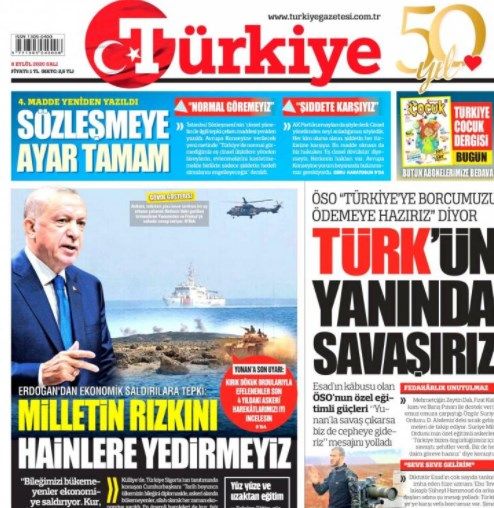 Συγκεκριμένα πρωτοσέλιδο της εφημερίδας «Türkiye», φιλοξενεί δηλώσεις μελών του αντικαθεστωτικού «Ελεύθερου Συριακού Στρατόού», οι οποίοι δηλώνουν έτοιμοι να πολεμήσουν στο πλευρό της Τουρκίας σε περίπτωση πολέμου με την Ελλάδα.