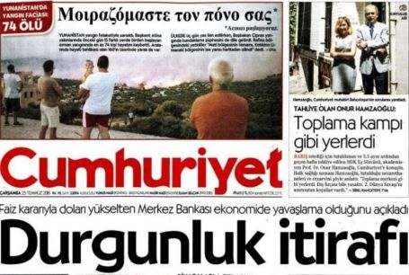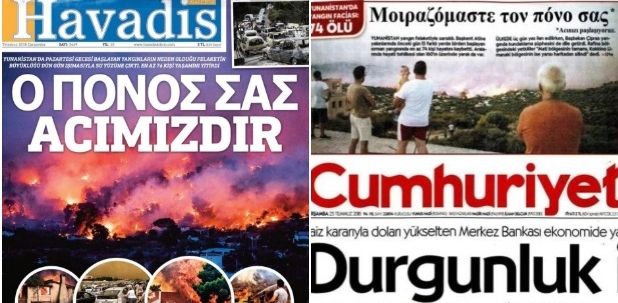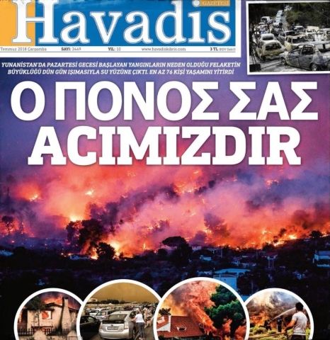 Στο πλευρό των πληγέντων από την πύρινη λαίλαπα στην Αττική και της χώρας μας στέκεται η τουρκικη εφημερίδα Cumhuriyet.