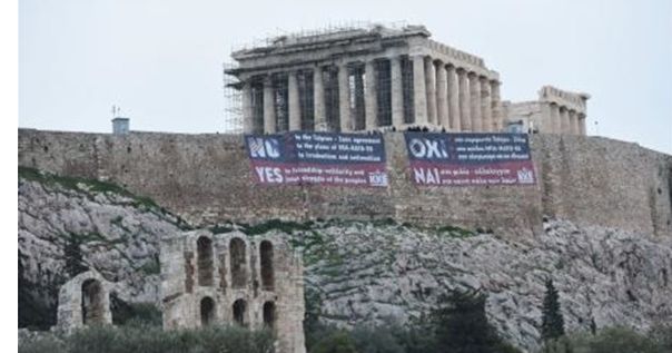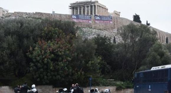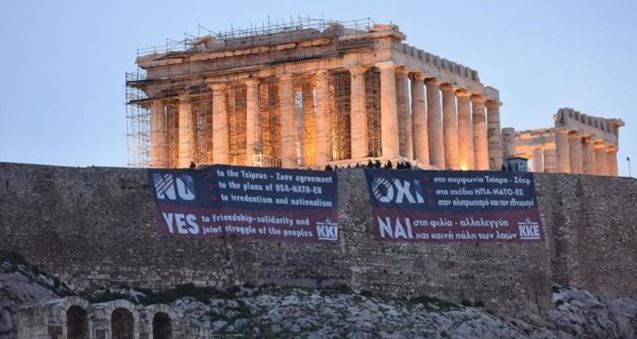 Δύο τεράστια πανό κατά της Συμφωνίας των Πρεσπών ανήρτησε το ΚΚΕ στην Ακρόπολη.
