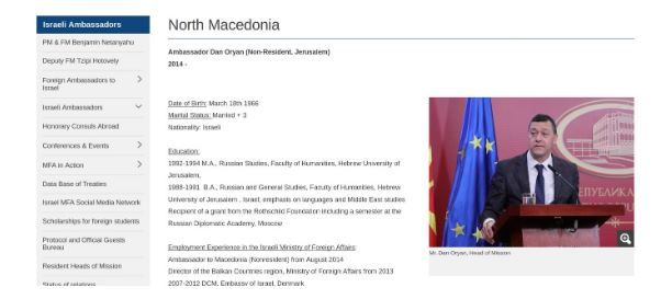 Στη σελίδα όπου παρουσιάζονται τα βιογραφικά του νυν και των πρώην Ισραηλινών πρεσβευτών στα Σκόπια, η ονομασία της χώρας έχει αλλαχθεί σε “North Macedonia” και η χώρα καταχωρήθηκε υπό το γράμμα “N” (=North Macedonia).