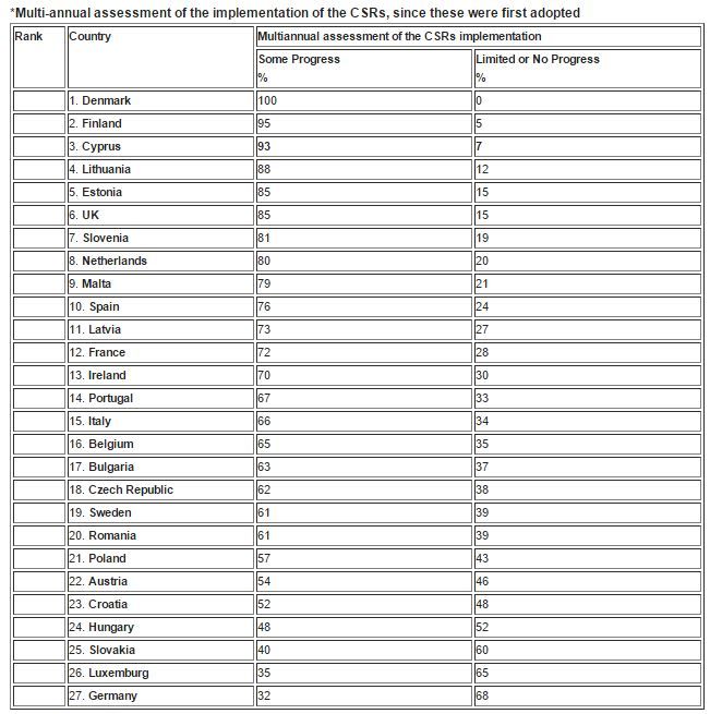 Οι Συστάσεις της Ευρωπαϊκής Επιτροπής σχετικά με το Εθνικό Πρόγραμμα Μεταρρυθμίσεων της Κύπρου για το 2017 (Country Specific Recommendations), είναι σε έναν μεγάλο βαθμό ευθυγραμμισμένες με τις προτεραιότητες της κυβέρνησης. Χωρίς αμφιβολία, η διασφάλιση της ανταγωνιστικότητας και της αναπτυξιακής προοπτικής επιβάλλει μια διαρκή μεταρρυθμιστική προσπάθεια. Σημειώνεται το γεγονός ότι η Κύπρος καταγράφει την τρίτη καλύτερη επίδοση στην εφαρμογή των Συστάσεων και του Εθνικού Προγράμματος Μεταρρυθμίσεων*.