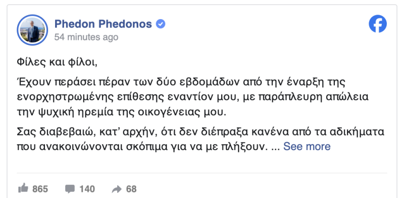 Έχουν περάσει πέραν των δύο εβδομάδων από την έναρξη της ενορχηστρωμένης επίθεσης εναντίον μου, με παράπλευρη απώλεια την ψυχική ηρεμία της οικογένειας μου.