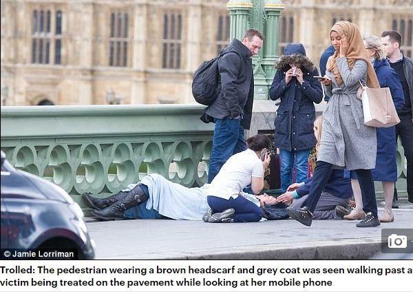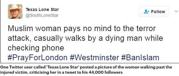 «Μουσουλμάνα δεν δίνει δεκάρα για την επίθεση τρόμου, περπατά ανέμελα δίπλα από έναν ετοιμοθάνατο άνδρα, κοιτώντας το κινητό της», έγραψε.