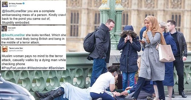 «Μουσουλμάνα δεν δίνει δεκάρα για την επίθεση τρόμου, περπατά ανέμελα δίπλα από έναν ετοιμοθάνατο άνδρα, κοιτώντας το κινητό της», έγραψε.