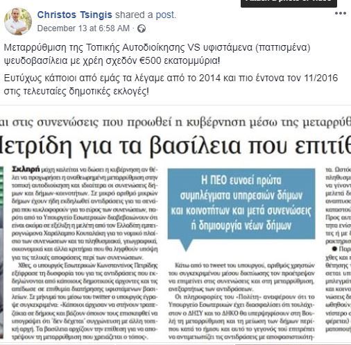 Σε παλαιότερη ανάρτησή του στις 13 Δεκεμβρίου, είχε σχολιάσει τη μεταρρύθμιση της Τοπικής Αυτοδιοίκησης VS υφιστάμενα (παττισμένα) ψευδοβασίλεια με χρέη σχεδόν €500 εκατομμύρια!