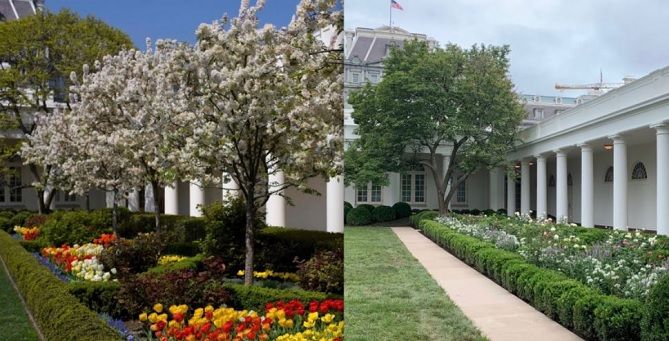 Η Πρώτη Κυρία επανασχεδίασε τον Κήπο των Ρόδων ώστε να είναι, ως επί το πλείστον, ένας συνδυασμός πράσινων θάμνων και λευκών και παστέλ λουλουδιών. Αφαιρέθηκαν οι κερασιές και οι πολύχρωμες τουλίπες από τον κήπο, ο οποίος είχε δημιουργηθεί το 1962 από την Τζάκι Κένεντι.
