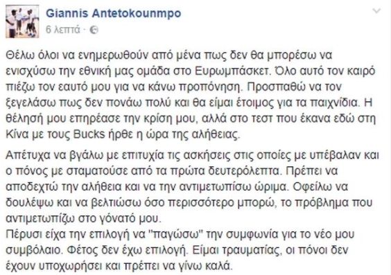 Ο Ελληνας σούπερ σταρ του NBA με την φανέλα των Μιλγουόκι Μπακς μέσω των λογαριασμών του στα social media ενημέρωσε πως δεν θα δώσει το «παρών» στο Eurobasket που ξεκινά στις 31 Αυγούστου, καθώς εξακολουθεί να έχει προβλήματα με το γόνατό του.