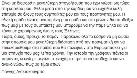 Τώρα, όμως, προέχει το παρόν. Παρακαλώ όλο το κόσμο να μη δώσει στην απουσία μου μεγαλύτερη διάσταση από την πραγματική και να επικεντρωθούμε στα παιδιά που θα παλέψουν στο Ευρωμπάσκετ για μια επιτυχία που μας λείπει χρόνια. Την ιστορία την γράφουν πάντα οι παρόντες κι εγώ με μεγάλη στεναχώρια πρέπει να αποδεχτώ και να ανακοινώσω πως θα είμαι απών».