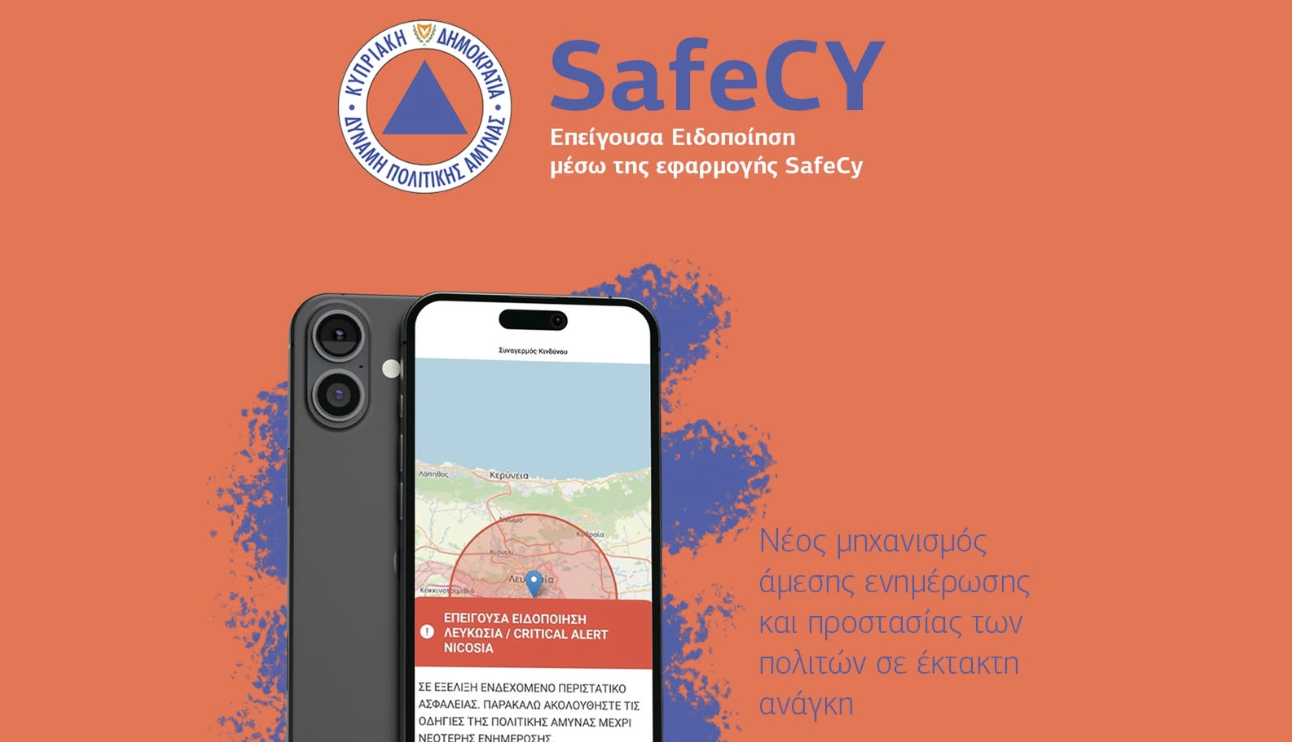 Το Υφυπουργείο Έρευνας, Καινοτομίας και Ψηφιακής Πολιτικής σε συνεργασία με το Υπουργείο Εσωτερικών και την Πολιτική Άμυνα ανακοινώνουν την αναβάθμιση της εφαρμογής SafeCY με νέα λειτουργικότητα Επείγουσας Ειδοποίησης προς τους πολίτες. Πρόκειται για ένα ακόμη συμπληρωματικό εργαλείο για την αμεσότερη και έγκαιρη ενημέρωση των πολιτών για τη λήψη μέτρων αυτοπροστασίας σε ενδεχόμενο περιστατικό ασφαλείας.
