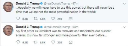 «Η πρώτη μου διαταγή ως Προέδρου ήταν να ανανεωθεί και να εκσυγχρονισθεί το πυρηνικό οπλοστάσιό μας. Είναι τώρα πολύ πιο δυνατό και πιο ισχυρό απ’ ό,τι ήταν ποτέ μέχρι τώρα», έγραψε στο Twitter.